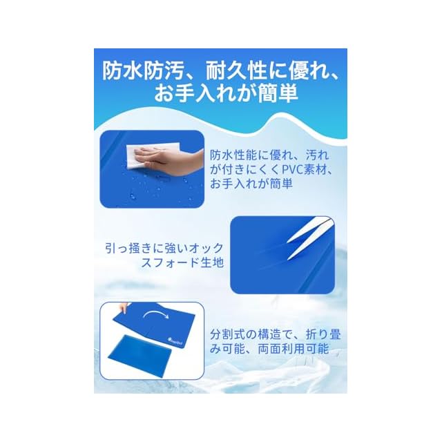 【耐久性・防水性・お手入れ簡単】ひんやりマットは環境に優しく耐久性のある高品質生地で作られており、二重縫製で、ジェル漏れを防止します。表面は防水性で水や汗、おしっこが染み込むのを防ぎます。汚れた場合は水で湿らせた布で簡単に拭き取ることができます。