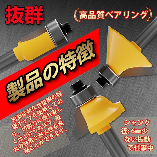▲12本組, 色: イエロー, シャンク径: 6㎜。ルータービットの刃部にYG6Xタングステン鋼合金を採用し&表面塗装, 切削力に優れ美しく仕上げられます, 最大の強度と耐久性を実現ことができます。