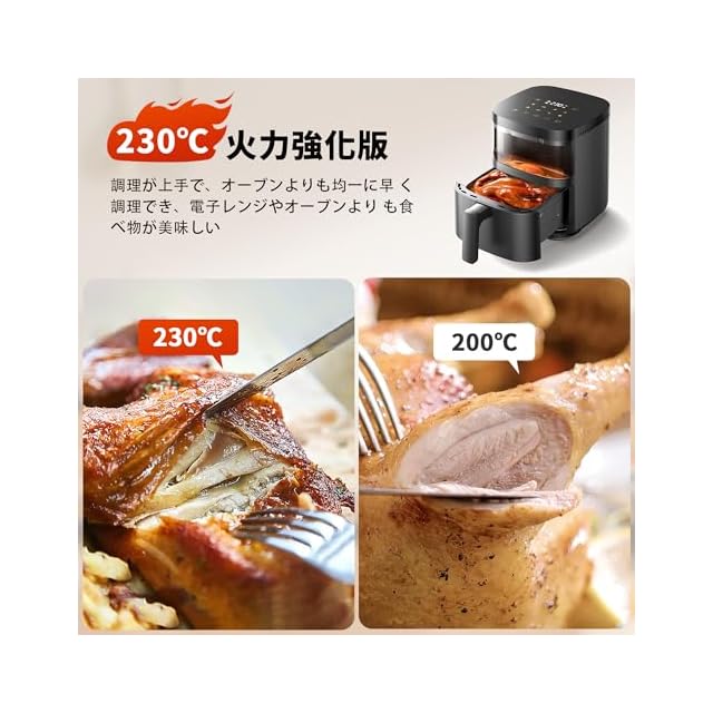 【よりサクサクした食感】このエアフライヤーは、230°Cまでの業界をリードする温度で調理され、これまでになく効率がさらに向上します。これに基づいて調理時間を短縮し、電気代の節約にもつながります。その上に、230℃の温度でお肉の中身がジューシー、外はサクッとした食感に仕上がります。カロリーを抑えながらカラッと揚げ物が食べられます。
