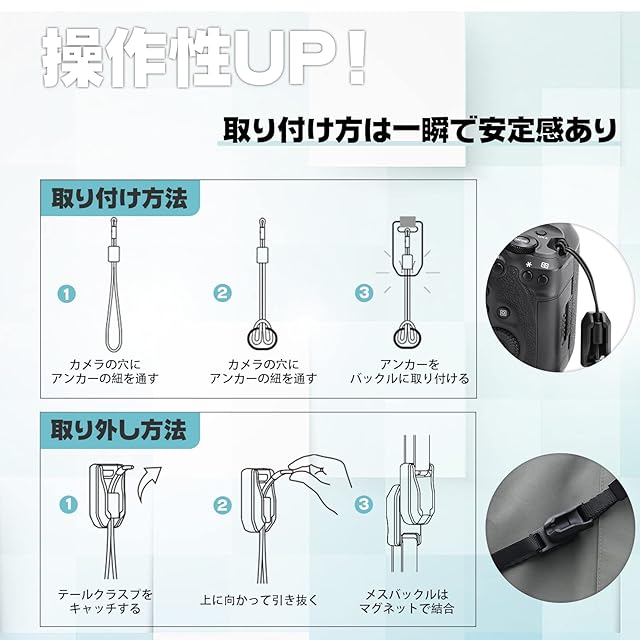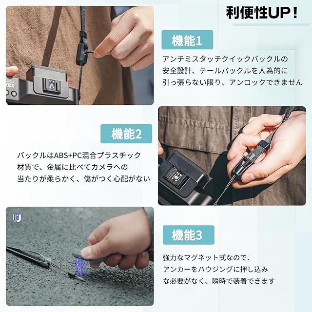 【脱着の操作性UP!】ワンタッチで簡単脱着できます。ハウジングの上部にはストラップを取り付ける横長の穴が空いています。アンカーはをカメラに、ハウジングをストラップに取り付けます。そして、アンカーをハウジングにのくぼみにアンカーリンクスをはめ込むこと、「パチン」と音がすれば取り付け完了です。強力なマグネット式なので、アンカーをハウジングに押し込みな必要がなく、瞬時で装着できます。カメラストラップを使用する際の手間を省くことができます。遊びなく固定されており、安定感があります。注:このバックルミニキットは、付属のストラップ穴があるカメラでのみ使用できます。