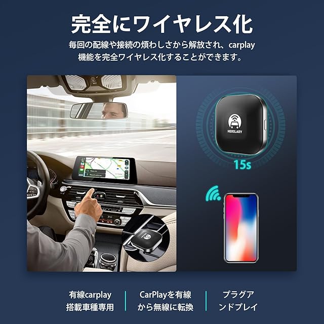 【完全に無線化】有線のCarPlayをワイヤレスにアップグレードするなら、Herilary C1-CPが最適なソリューションです。 iPhoneをポケットから取り出さなくても、ワイヤレスCarPlayの便利さを享受することができます。 付属のUSBケーブルでC1-CPとヘッドユニットを接続するだけで、このコンパクトなボックスでワイヤレスCarPlayが利用できるようになります。毎回の配線や接続の煩わしさから解放され、carplay機能を完全ワイヤレス化することができます。