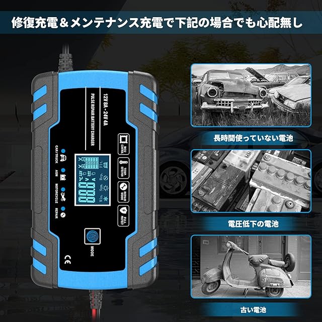 ★修復機能★:電圧が低下したバッテリー、長時間使っていないバッテリー、古いバッテリーに適用できる修復充電モードで、パルス充電で、サルフェーションを除去して、バッテリーを恢復されます。