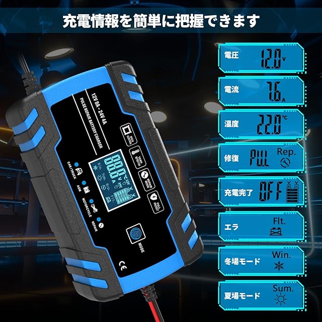 ★12Vと24V適用★:12Vバッテリーも24バッテリーも利用できて、設定不要で、自動にバッテリーの電圧を識別します。バイク、オートバイク、自動車、ヨット、トラック等のAGM、GEL、密閉型、開放型の鉛バッテリーは使用できます。