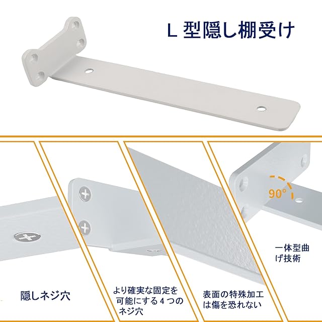 多機能:清潔でモダンな外観を維持しながら、実用的な収納スペースを確保します。一度取り付けられると、これらの隠さ棚受け金具は完全に見えなくなり、浮いている棚のように見えます。これらの棚 壁掛け 金具、中小規模の本棚、陳列棚、庭の棚、外壁の棚としてだけでなく、キッチン、バスルーム、ベッドルーム、オフィスなどの場所でも使用できます。