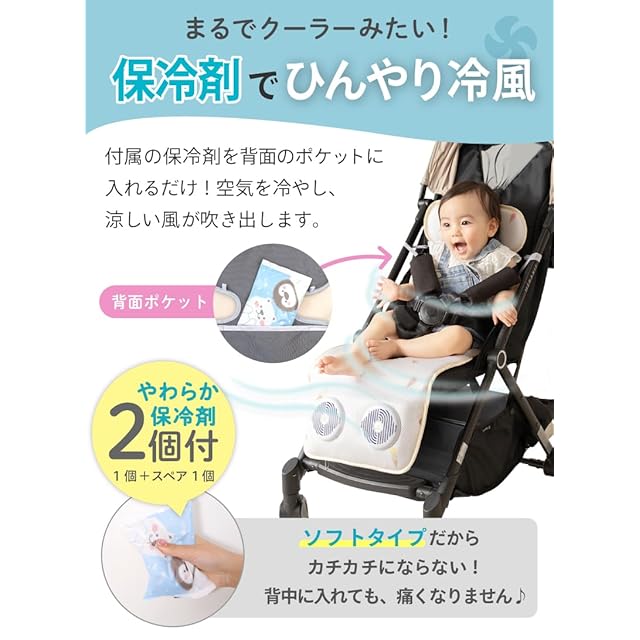【保冷剤セット】保冷剤は嬉しい2個(1個+スペア1個)付き。冷凍してもカチカチにならないソフトタイプだから赤ちゃんに当たっても痛くない、赤ちゃんの背中を優しく冷やします。保冷剤+ファンでひんやり冷たい風がシートから出るから体感温度はなんと-5℃。