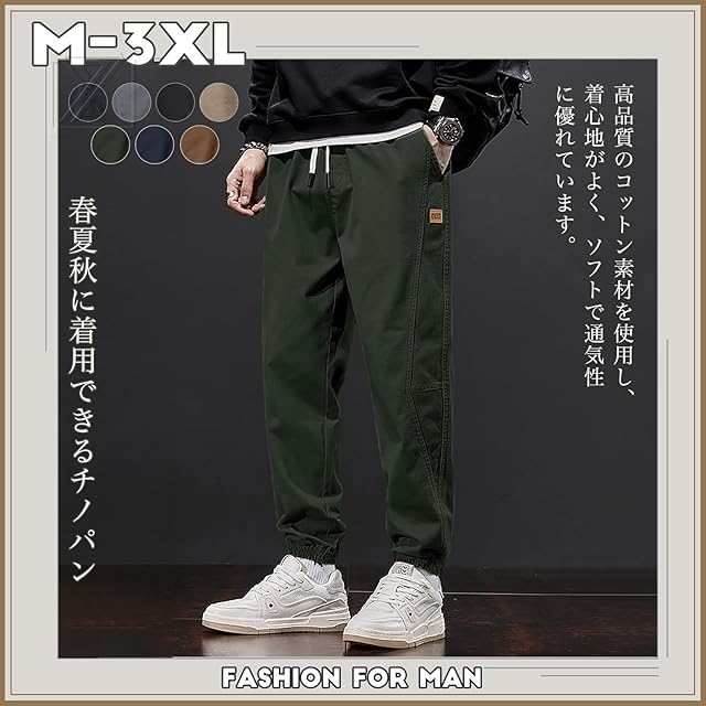 [Kayiyasu] チノパン メンズ ズボン パンツ ワークパンツ 大きいサイズ 裾リブ M~3XL ウエストゴム リラックス ボトムス 綿 黒 調整紐 アンクル丈 9分丈 ゆったり ずぼん かっこいい 無地 人気(M アーミーグリーン)