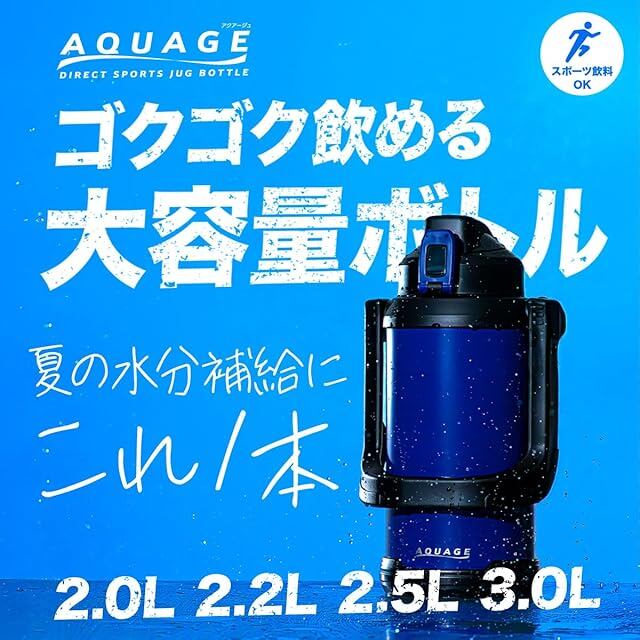 【大容量 2.2リットル】 アトラス 水筒 保冷 スポーツジャグ スポーツドリンク対応 真空断熱 ステンレス 直飲み 洗いやすい ワンタッチ 広口 手が入る ハンドル付き 持ちやすい 底プレート付き オレンジ AQUAGE アクアージュ ADJB-2200OR