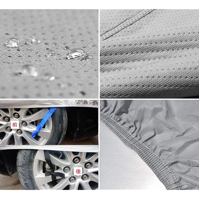【4層構造】外層防水ボディカバー:環境にやさしい高密度不織布(重:160g/m2)を使用します。これは防湿性があり、手触りが軽くて柔らいです。中層:PPフィルムと二層高比重不織布で,空気を通し、防水性能がもっと良いです。内層:さらに柔らかい感触の裏起毛素材で、強風がボディカバーを巻き起こして車を擦傷することを防ぐことができます。