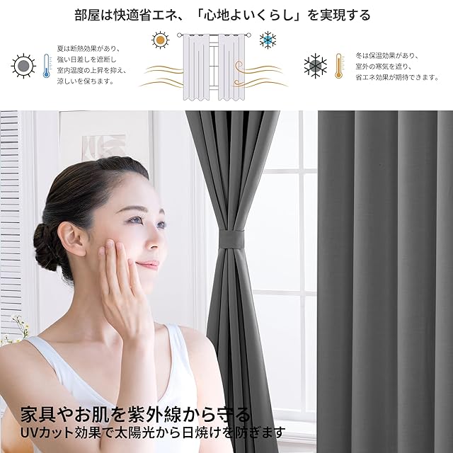 【完全遮光】三層1級遮光素材(JISにより遮光度99.99%以上)で、日光や街灯の光をしっかり遮断します。室外陽光阻まれて、たとえ猛暑が続くても、薄暗く涼しい雰囲気を持っています。UVカットほとんど100%紫外線をカットできるので、フローリングや家具の日焼け防止もおすすめです。夏は強い日差しを遮断し室内温度の上昇を抑え、冬は室外の寒気を遮り、省エネ効果が期待できます。色によっても遮光性に異なるため、同じ1級遮光カーテンでDeconovoからの濃い色の選んで遮光効果もっと良いです。