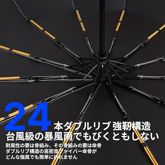 【 台風対策|24本ダブルリブ構造の剛性】耐風速25m/s|高密度ファイバー傘骨が折れにくさ業界をリードする!ダブルリブ構造の高密度ファイバー傘骨が、どんな強風でも簡単に折れません!