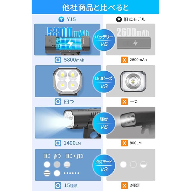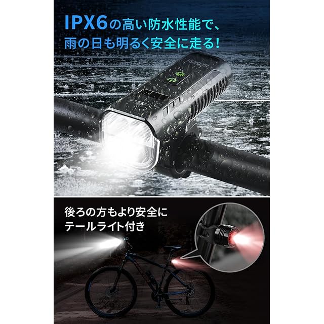 【5800mAh大容量&LED残量表示】内蔵の5800mAhバッテリーは、最大12時間の中輝度点灯や40時間のフラッシュ点灯を可能にします。長時間の使用にも耐え、LED残量表示機能があり、バッテリー残量を容易に確認できるため、常に使用可能な状態を維持できます。これにより、長距離走行や夜間のアウトドア活動においても安心して使用できます。
