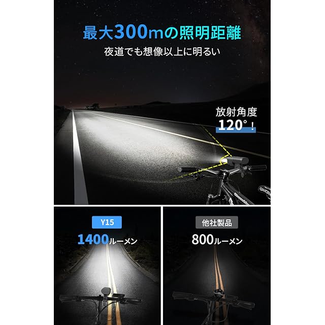 【1400ルーメン&15種類のライト】この自転車用ライトは、1400ルーメンの強力な光を放ち、広範囲にわたる照射を可能にし、暗闇でも道路や路面の状況を明確に把握できます。LEDビーズが4つ搭載され、ハイビーム、ロービーム、全点灯の切り替えができます。高輝度、中輝度、フラッシュ、スローフラッシュ、SOS点滅の5つの照射モードを含む、合計15種類のライトモードを提供します。様々な照明状況に対応し、自転車走行中の安全性を向上させます。