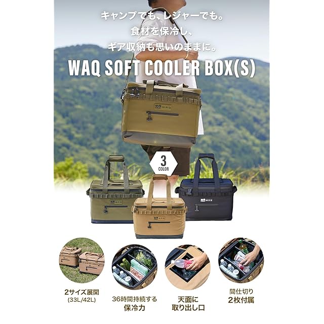 ✔【用途によって選べる2サイズ展開】Sサイズは1〜2人ぐらいまでのキャンプに最適な容量35L。食材や飲み物のスペースを分けるときに内部を区切るための仕切り板が2枚付属。食材や飲み物のスペースを区切るときにご活用ください。【クイックアクセス機能搭載】保冷力の持続はいかにクーラーボックス内の冷気を外に出さないかが重要。WAQのソフトクーラーボックスは天面に取り出し口を設けることにより、ファスナーを開け閉めせずに中身を取り出すことが可能に。必要なものをサッと取り出すことで中の冷気を必要以上に逃さずキープし続けます。