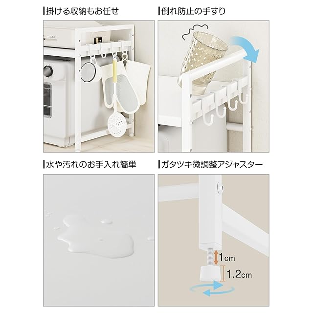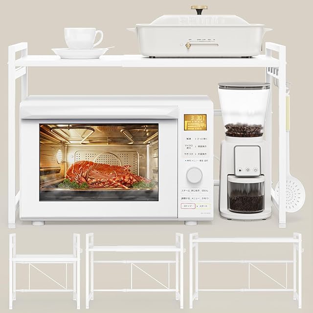 電子レンジ上のデッドスペースを有効活用できる伸縮キッチンラック:レンジ上ラックは、約幅36cm~65 cm(内寸)で無段階調整できる、可動棚板は約5.5cm間隔で3段階で高さ調節可能です。レンジの大きさや収納物の量、置く場所の広さなどに合わせたご家庭のキッチンにちょうどいい形で設置していただけます。サイドバーを4個s字フックなどを使用した吊り下げ収納に使えます。レンジラックとして使えるし、洗面台の下の棚としても使える、リビングでも使えます。オーブンレンジラックは黒、白、ブルー、グリーンの4カラーがあります。
