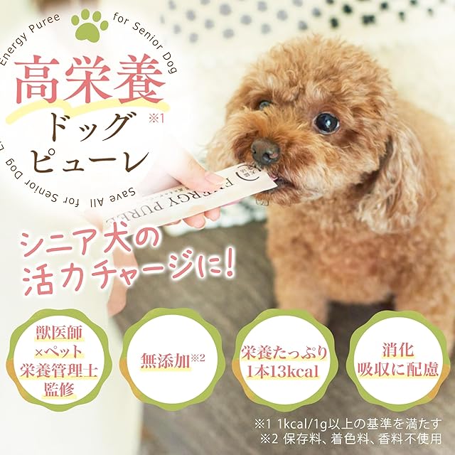獣医師×ペット栄養管理士監修の高栄養*2ドッグピューレ:1本で栄養もカロリーもしっかりと摂取できるピューレ状のおやつです。身体への負担も考慮し、効率よくエネルギーが摂取できる消化に優しいMCTオイルを採用。低リン&低ナトリウムで腎臓にも配慮した栄養設計です。保存料、着色料、香料不使用で、シニアのわんちゃんや食が細くなってきてしまっているわんちゃんにおすすめの高栄養*2ドッグピューレです。 *1kcal/1g以上の基準を満たす
