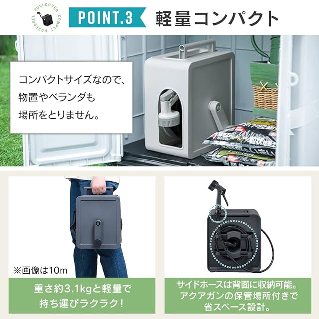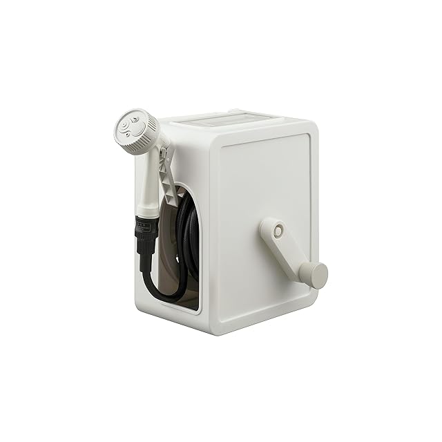 【アーチ型設計で“巻き取りスムーズ”】本体はハンドルを回すだけでスムーズに巻き取れるアーチ型設計。アーチ状の巻き取り口がホースのねじれや片寄りを防ぎ、濡れたアクアガンを触らずに片付けができる。ホースは丈夫で絡まりにくい“耐圧糸(100デニール)/防藻インナー(日光を遮断)/ノッチ加工”仕様。【取り付け/外し“簡単ワンタッチ”】付属の蛇口口金を水道口につなげておけば、片手で楽に取り付け/取り外しができる。【使いやすさにこだわった便利な設計】持ち運びしやすい取っ手で移動も楽ちん。フック付きなので小物もかけられて便利。