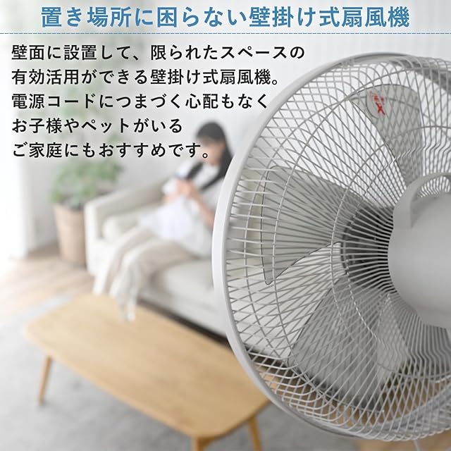 【壁掛け扇風機】壁面に設置して、限られたスペースの有効活用ができる壁掛け扇風機。ワイドな風を送る羽根径35cmの大型タイプ。置き場所に困りがちな脱衣所・洗面所などで活躍します。リモコンが付属しているので、高い場所に設置しても操作は簡単です。