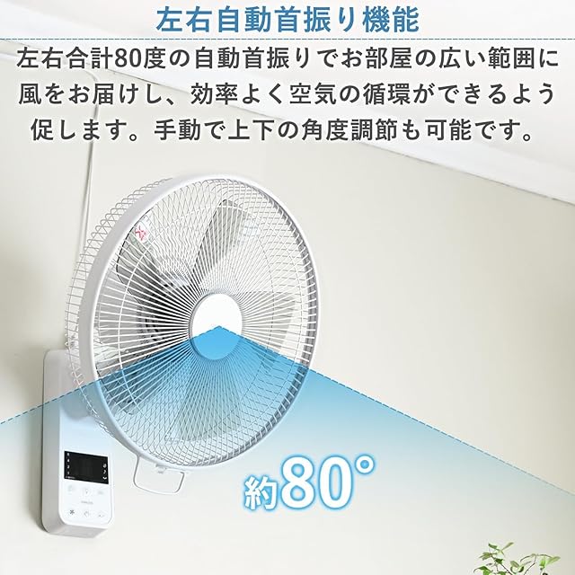 【首振り】左右合計80度の自動首振りでお部屋の広い範囲に風をお届けし、効率よく空気の循環ができるよう促します。手動で上下の角度調節も可能です。