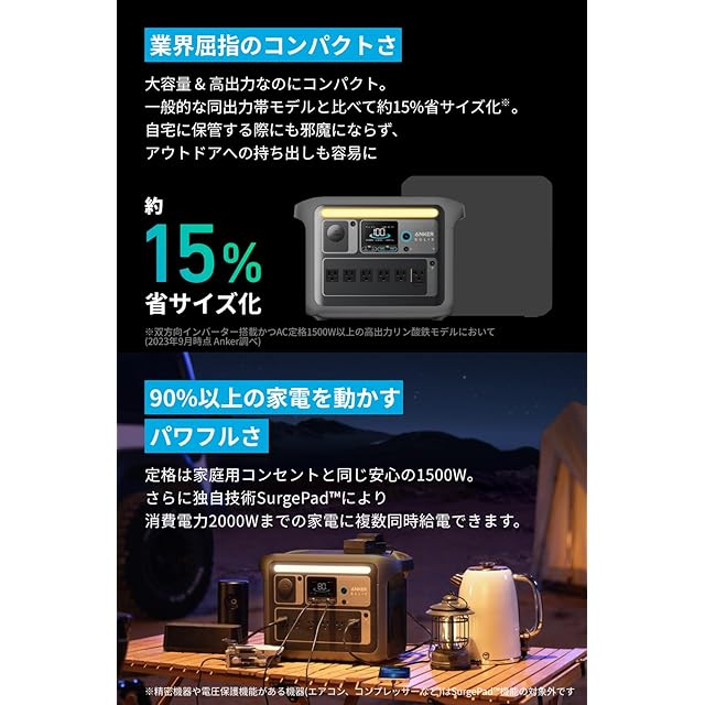 90%以上の家電を動かすパワフルな出力:ACポートの定格出力は家庭用コンセントと同じ安心の1500W。さらに独自技術SurgePadにより消費電力2,000Wまでの家電※に給電可能。アウトドアから停電時まであらゆるシーンで活躍します。(※精密機器や電圧保護機能がある機器は対象外)