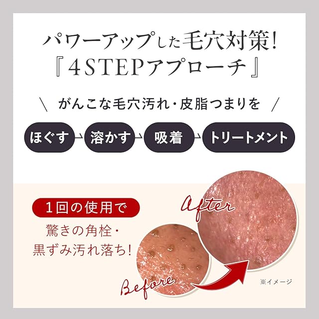 〈ザ クレンジングバーム ブラックリペアの特徴〉 パワーアップした毛穴対策!『4STEPアプローチ』\がんこな毛穴汚れ・皮脂つまりを/①ほぐす:古い角栓や肌表面をほぐす②とかす:角栓の元となる皮脂を溶かす③吸着:頑固な角栓・黒ずみ汚れを吸着オフ④トリートメント:汚れが取れすっきりした肌に毛穴に美容成分が浸透*4し、毛穴の目立たない肌*6へ