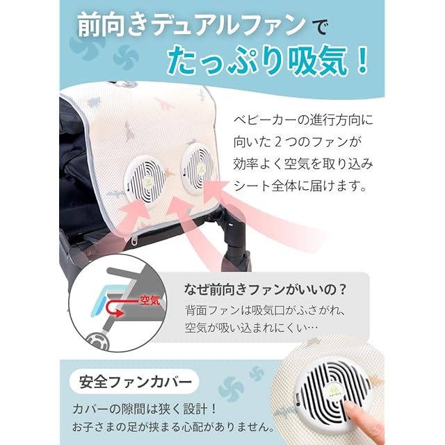 【前向きWファンでたっぷり吸引】前向きについたデュアルファンがベビーカーの進行方向方からたっぷり吸気、シート全体にある38個の空気穴から全身にひんやり涼しい風を届けます。