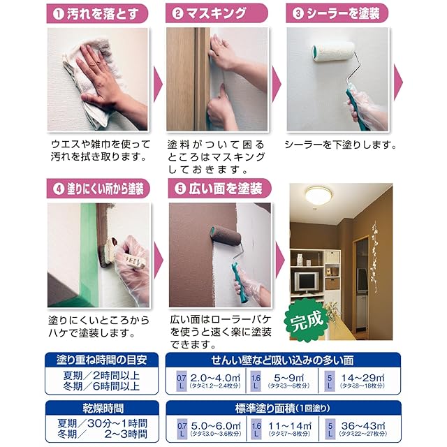(標準)塗り面積:0.7L/【1回塗り】5~6㎡ (タタミ3~3.6枚分)【吸い込みが激しい面】2~4㎡(タタミ1.2~2.4枚分)