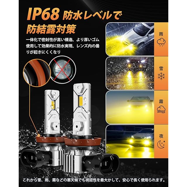 【視認性が抜群なh8 led フォグ 爆光 黄色】BORDAN社 h11 led フォグランプ イエロー光は波長が長く、冬場や雨、雪、霧などの状況に適しており、夜間は快適な運転ができ、また完璧な貫通性能を発揮することもできます。人間の目で見ても運転手にとっても非常に容認しやすいのですが、疲れません。※ご注意:製品の明るさは取り付けられる車両により異なります。