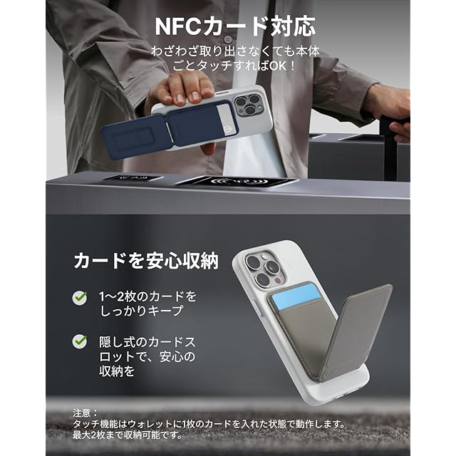 【NFCカード対応!かざすだけでアクセス】マイナンバーカードや運転免許はもちろん、お札や名刺、Suicaなどの交通系ICカードやタッチ決済に対応したクレジットカード、カードキーまで収納可能。カバンから取り出す手間なく、本体ごとタッチするだけでスムーズな決済が可能です。カードケースには1~2枚のカードまで収納できますが、NFC機能を使用するためには、カードを1枚だけ入れてください