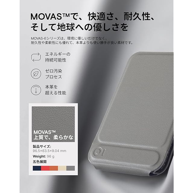 【MOFTならではの質感・独自開発素材】「MOVAS」は、MOFTが独自開発したヴィーガンレザーです。肌に優しく、まるで本革のような、しっとりとしたなめらかな触り心地を実現しました。動物性原料を一切使用せず、DMFも含まない、環境に配慮したサステナブルな素材です。