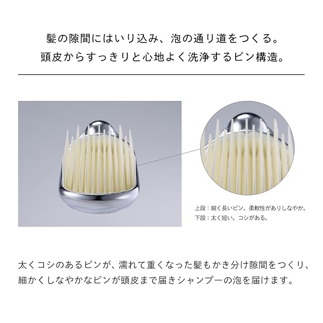 山形構造になった2種のピンが、髪と頭皮にたっぷりの泡を行き渡らせながえあ、摩擦レスで心地よい刺激を与え、頭皮の細かい汚れもオフします。