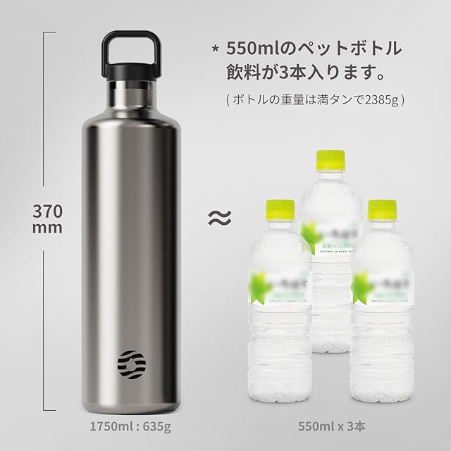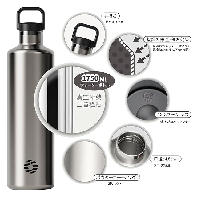 FJbottle 水筒 1.75リットル 真空断熱 保温 保冷 第2世代 ステンレスボトル 直飲み スポーツボトル スポーツ飲料対応 水筒カバー付き 男の子 女の子 大人 子供 シルバー