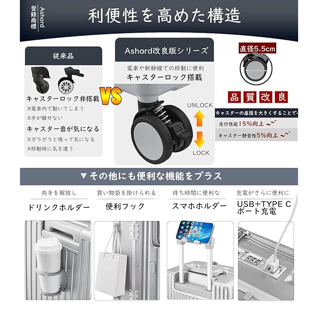 「キャスター ストッパー付き 、USB+Type C充電ポート付き 、 カップホルダーとスマホルダーを付く」 ASHARDフロントオープンシリーズのバージョンアップモデルです。走行中の揺れる電車内でもストッパー(ブレーキ)機能でピタっと自立。乗降時や座席の離着席時などではすぐにストッパー解除ができるのでスムーズに移動を再開することができます。スーツケースにモバイルバッテリーを収納するポケットがついており、 USB+Type Cポートの充電口が外にあることで、いつでもどこでも充電できます。便利な折りたたみ式ドリンクホルダー付き。バックカップホルダー、ミルクティーカップ、傘いつでも配置でき、旅行をより便利にすることができます。レバーの上部にはスマホルダーが付いているので、フライトの待ち時間に両手が自由になり、外出先でもリラックスできます。