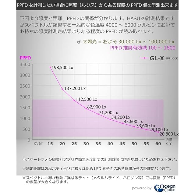 植物育成を想定した高密度フルスペクトルLEDは各距離でのPPFD値も高く植物の光合成をサポートします。