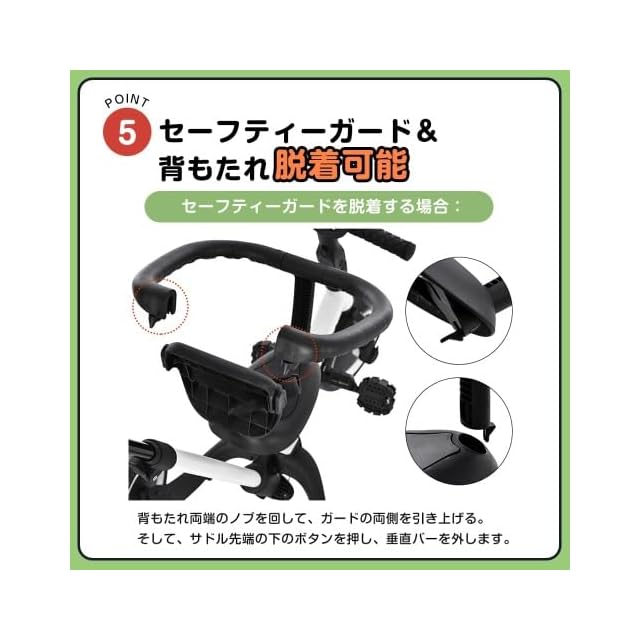 【安全性が高い!】①こどもがハンドルを急旋回させ、曲がりすぎることを防ぐため回転角度を制限し、より安全性を高めました。②赤ちゃんの安全をより効果的な保護できます。 お子様の体型に合わせて、高さ25cm調整できるサドルとハンドルは6段階を調整できます。③三輪車の後部に付いているコントロールバーには進む方向を操作できる舵切り機能付き!