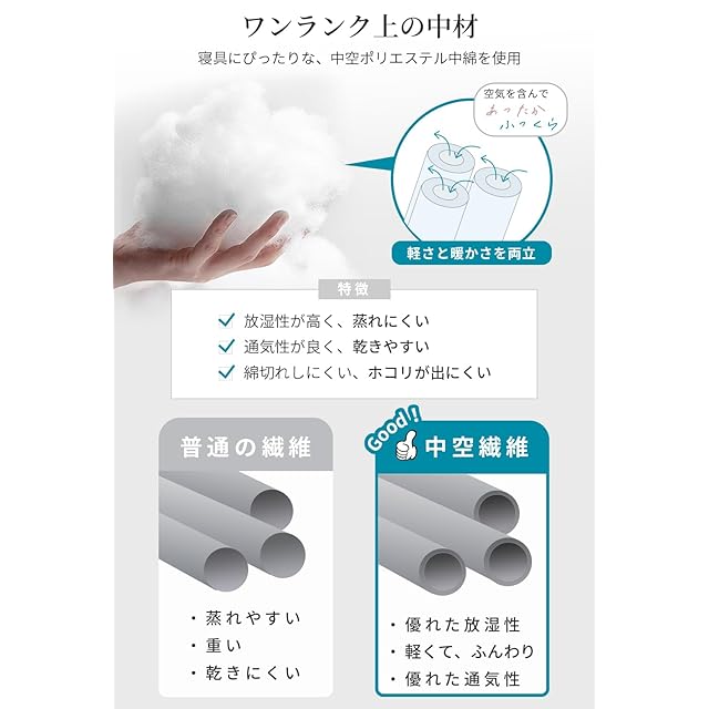 【柔らかな肌触り】ピーチスキン加工を表生地に施し、柔らかく滑らかな肌触りに。ほこりが出にくい、綿切れしにくい、中空ポリエステル綿を使用。