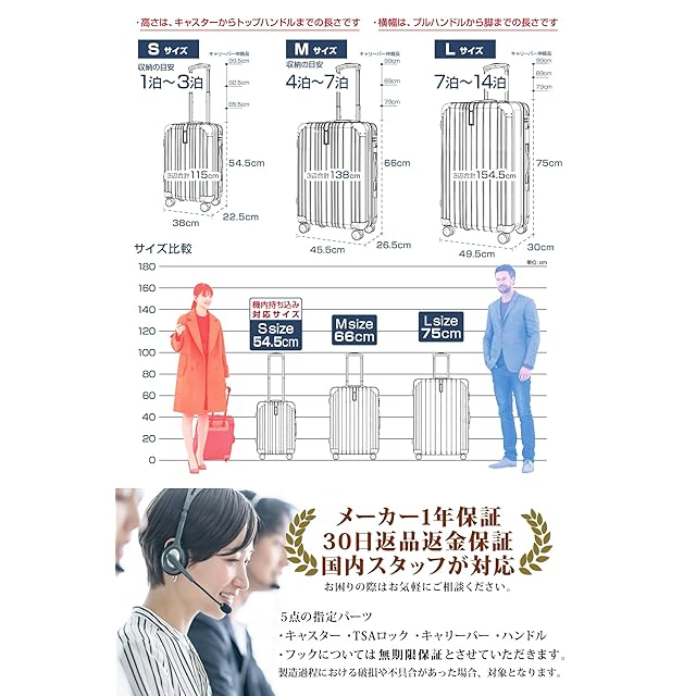 【 指定パーツの新品不具合時の無期限 】VELSKYFはキャリーバー、キャスター、ハンドル、TSAロック、フックの5点について期限を設けておりません、国内でサポートいたします。※製造過程での破損、不具合があった場合に限ります