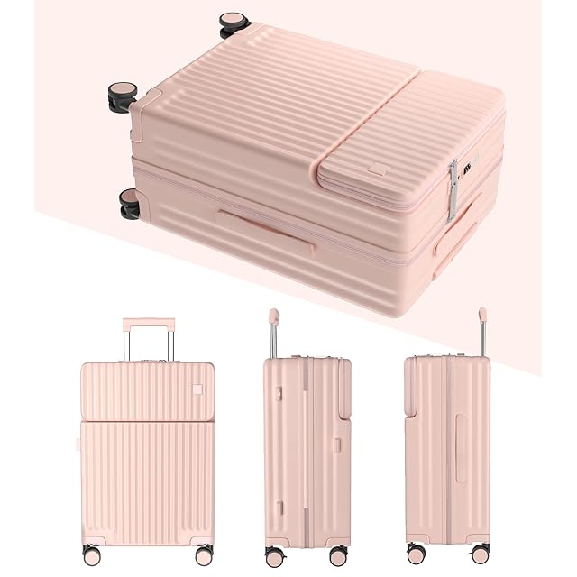 [Ashard] キャリーケース 多機能 スーツケース ストッパー付き Type C と USBポート付き フロントオープン ジッパー キャリーバッグ 携帯スタンド カップホルダー付き 隠しフック機能 超軽量 耐衝撃 静音 360度回転キャスター 100%PC材質 人気 頑丈 可愛い TSAロック搭載 旅行 ビジネス 出張 修学 (Mサイズ/4~7泊/65L/託送必要, ピンク)
