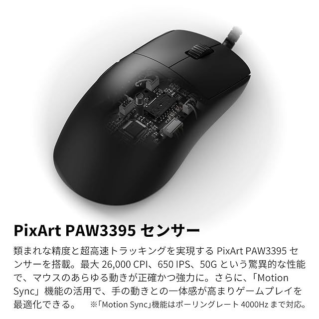 【共同開発したメカニカルスイッチ「Kailh GX」】Endgame GearとKailh社が共同開発した、ユニークな内部構造と特性をそなえるメカニカルスイッチ「Kailh GX」を搭載。短く、はっきりとしたクリック感で、確かなフィードバックがゲームコントロールを強化する。 【PixArt PAW3395センサー】類まれな精度と超高速トラッキングを実現するPixArt PAW3395センサーを搭載。~26,000 CPI、650 IPS、50Gという驚異的な性能で、マウスのあらゆる動きが正確かつ強力に。さらに、「Motion Sync」機能の活用で、手の動きとの一体感が高まりゲームプレイを最適化できる。※「Motion Sync」機能はポーリングレート4000Hzまで対応。