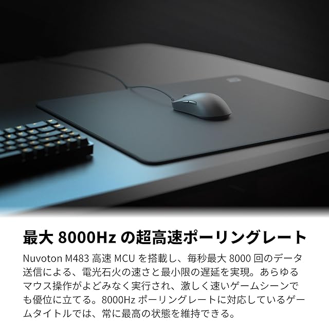【8000Hzの超高速ポーリングレート】Nuvoton M483高速MCUを搭載し、毎秒最大8000回のデータ送信による、電光石火の速さと最小限の遅延を実現。あらゆるマウス操作がよどみなく実行され、激しく速いゲームシーンでも優位に立てる。8000Hzポーリングレートに対応しているゲームタイトルでは、常に適切な状態を維持できる。 ※マウス裏面の「mode」ボタンを長押しで、8000Hz→4000Hz→2000Hz→1000Hzに変更可能。