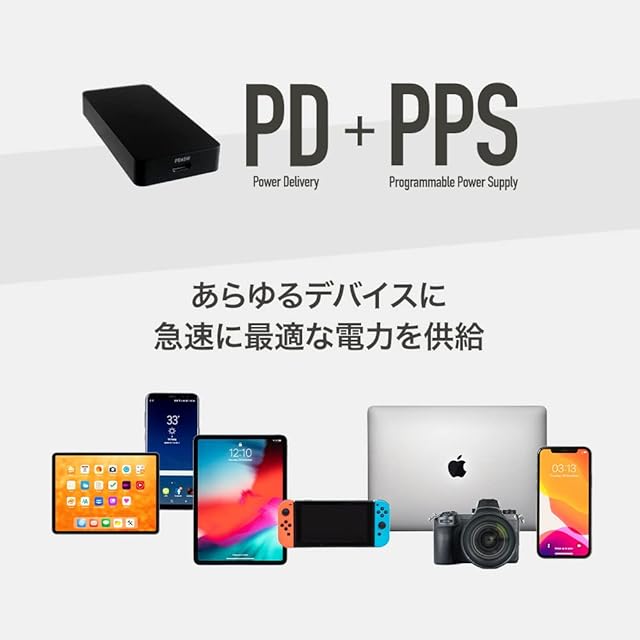 USB PDより効率的な充電が可能な「USB PD-PPS」:USB PD-PPS(Programmable Power Supply)は、USB PDのオプション規格です。高出力・充電時間の短縮が特徴のUSB PDから更に電圧・電流を細かく最適化することで、発熱や変換ロスを最小限に抑えられる仕組みです。※USB PD-PPSでの充電は、充電する端末がPD-PPS対応であり、使用するケーブルがPD対応である必要があります。