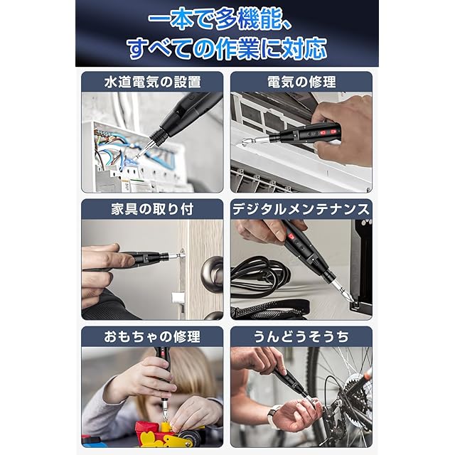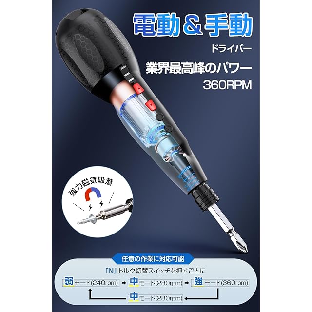 【最大3-10Nm・電動&手動両用】この 電動ドライバー は、最大トルク3-10Nmを実現し、電動モードと手動モードの両方を備えています。重労働にはパワフルな電動モードを、細かい調整には正確性を要求される手動モードを選択できます。これ一台で、家具の組み立てから機械のメンテナンスまで、さまざまな作業ニーズに応える万能さを持っています。