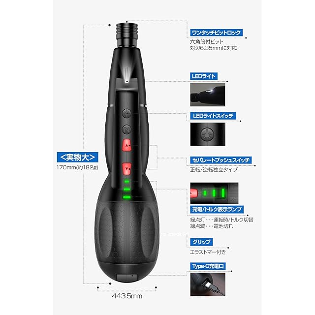 商品名:【DIY専用・初心者向け】 電動ドライバー 小型 Type-C充電式 磁石付き プラス/マイナス/四角/六角/星型 電動ドリル コードレス 16点ビット ドライバーセット 延長棒付き 手動兼用/トルク3段階/正逆転切替 ドライバー 電動 連続100分稼働 LEDライト コンパクト DIY 工具 家庭/DIY/家具組立用 日本語説明書付き 収納ケース