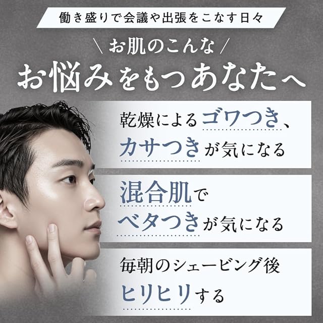 手軽に時短ケアで、ずっと誇れる男前肌を。未来の肌に、今から潤いケア。 伸びが良いので、1日2回の利用で約2ヶ月使用可能。(1回1.25ml使用計算)