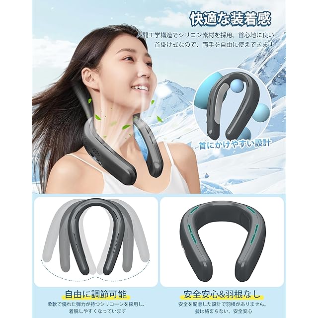 【快適な着用感&両手解放&どこへでも簡単に持ち運び】首掛け部には柔軟性のあるシリコン素材を採用し、着脱しやすくなっていますし、人間工学に基づいた滑らかな曲線デザインで、首のラインにフィットし、長時間使用しても首への負担がない 首掛けエアコン となり となり。首にかけるだけで即座の涼しさを感じることができ、両手が自由になります。活動的なアウトドア活動や長時間の作業中でも、首や肩の疲れを感じることなく快適に過ごせます、暑い時に、旅行、散歩、買い物、遊園地などの夏の風景を楽しむ時に大活躍!!