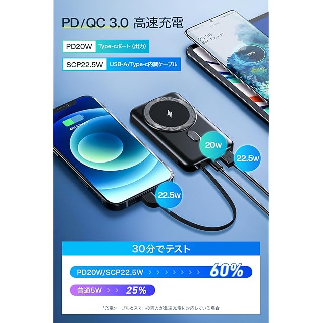 【PD20W/22.5W急速充電・PD/QC3.0対応】 PD/QC3.0対応し、圧倒的な充電スピードを持ち、PD対応機種でしたらわずか30分で0%から60%に充電可能な急速充電器です。短時間で携帯電話の電力を回復させることができます。小体積で出張や旅行などの短期外出だけでなく、緊急事態時に非常用電源としても持ち運びに便利です。