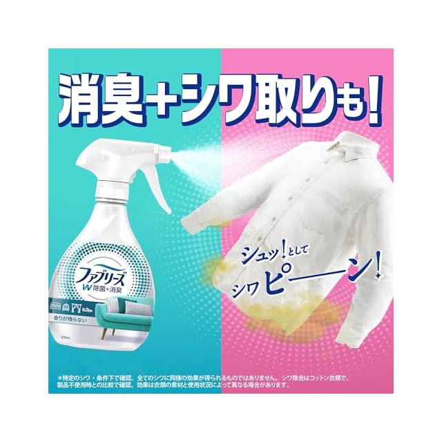シュッとスプレーして伸ばせばシワ取りも!特定のシワ・条件下で試験。(全てのシワに同様の効果が得られるものではありません。シワ除去はコットン衣類で、製品不使用時との比較で検証。効果は衣類の素材と使用状況によって異なる場合があります。)