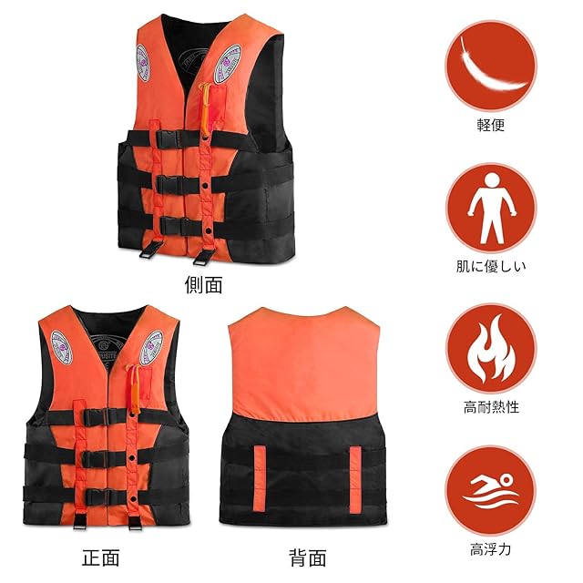 【4色で6サイズ、安全性を向上させ】 青、黄色い、赤とオレンジで4色、S~XXXLまで6サイズ用意しており、30KGな子供より100KGな大人までも対応できます。反射帯付きなので、鮮明的な色を採用して浜辺などの人込みでもひときわ目立ち、姿を見失っても「あそこにいる!」って見つけやすいです。泳ぐことに邪魔にならずに確実に浮力を確保できるデザインです。