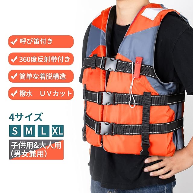 ライフジャケットフローティングベストセット 呼び子付き 救命胴衣 子供用 大人用 男女兼用 反射バンド付き4色&4サイズ… (オレンジ, L)