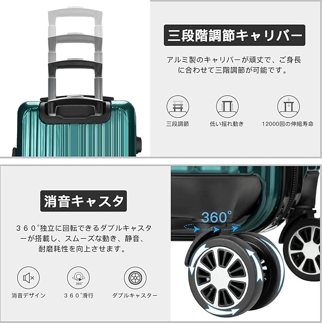 [VARNIC] スーツケース キャリーバッグ キャリーケース 超軽量 大型 静音 ダブルキャスター 耐衝撃 360度回転 TSAローク搭載 ファスナー式 旅行 ビジネス 出張 (グリーン, Lサイズ/98L(7泊~長期旅行))