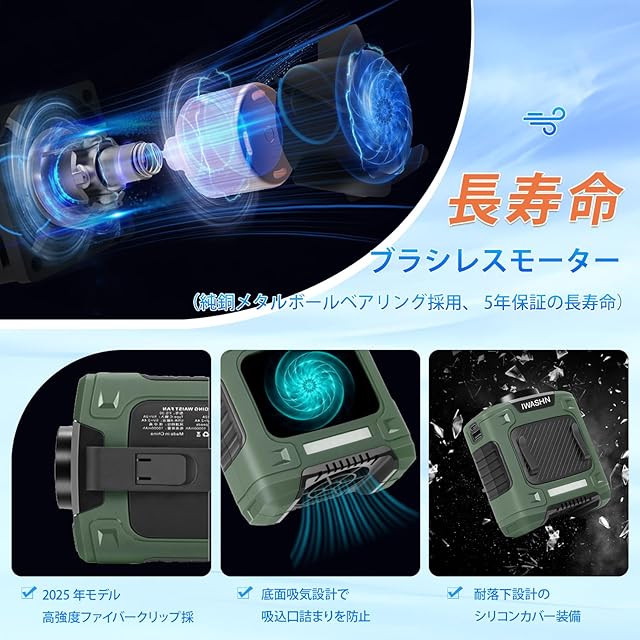 【高速で長寿命のブラシレスモーター & 下部吸気設計】通常のコンパクトなベルトファンと比べて、長寿命の高速ブラシレスモーターを採用しており、風力が強く、寿命が5年以上もあります。底部の進風設計により、衣服による吸気口の遮蔽を防止します【非常に重要】。SOSランプや懐中電灯も備えており、屋外作業者に最適です。